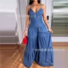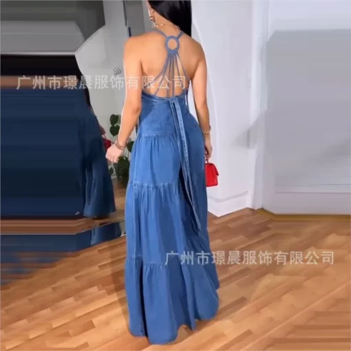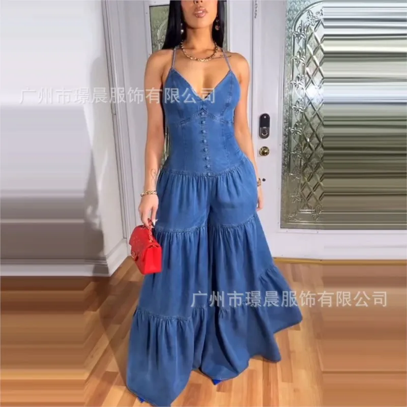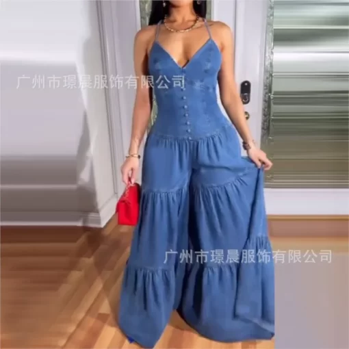 Sexy Elegant V Neck Halter Jumpsuit Dress For Women 2025 Summer Sleeveless Backless Denim Blue New Fashion Fold Party Jumpsuit